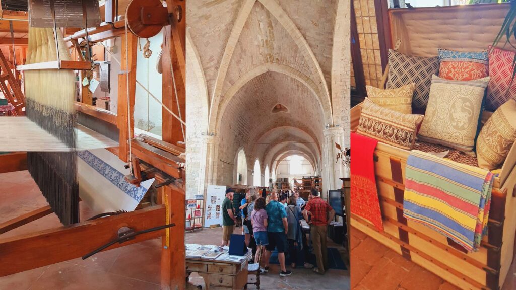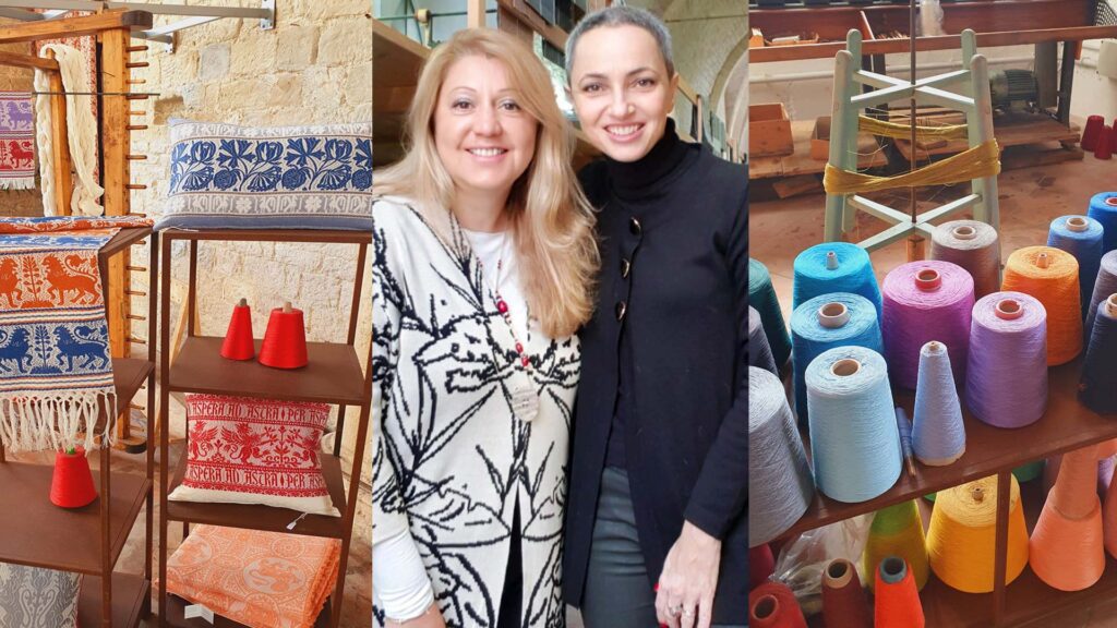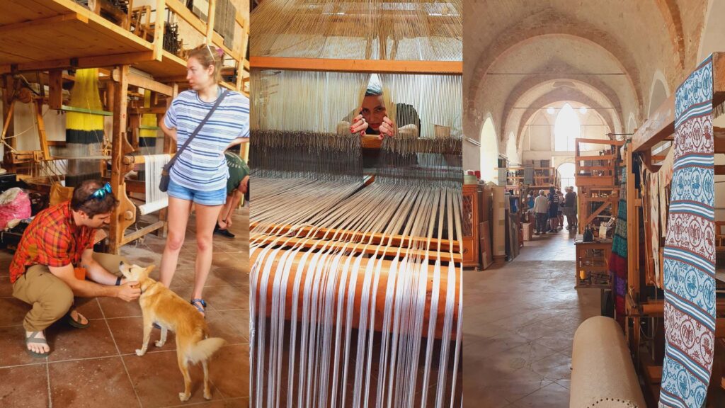 The first time I went to Marta’s Lab it was a lovely spring afternoon. Marta, a very joyful and vibrant lady, walked us to her traditional wooden frame hand-weaving workshop. It turns out her lab was inside a 13th-century church and former monastery that her family restored and saved from decay. So just walking inside this building with a very high and pointed vaulted ceiling was emotional.