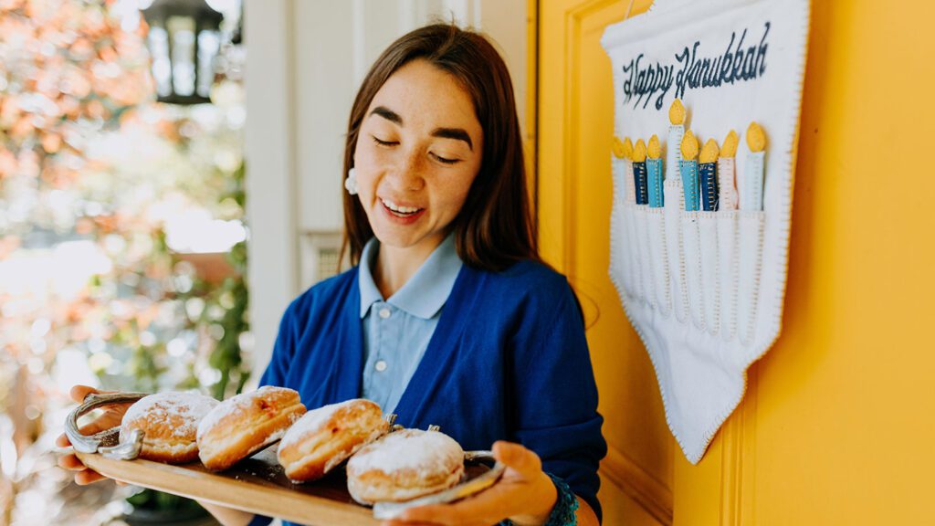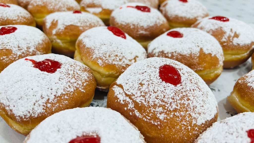 Food is a big focus, as it should be! Many delicious fried treats are popular – the oily, greasy foods symbolising the oil of the temple. Traditionally families might eat fried potato latkes or sweet treats like doughnuts cooked in olive oil.