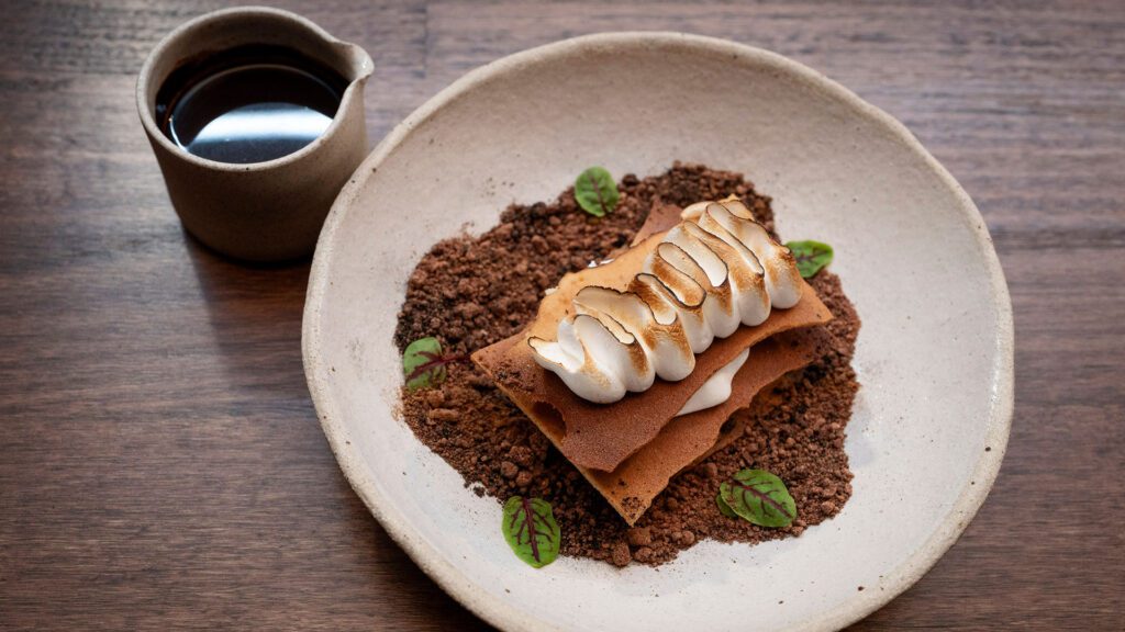 - Scatter cinnamon and charcoal soil around the S’more. Add micro herbs and serve with chocolate sauce