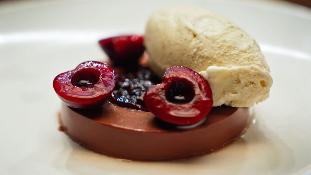 - Quenelle the ice-cream and place on top of the crémeux. Garnish with pickled cherries