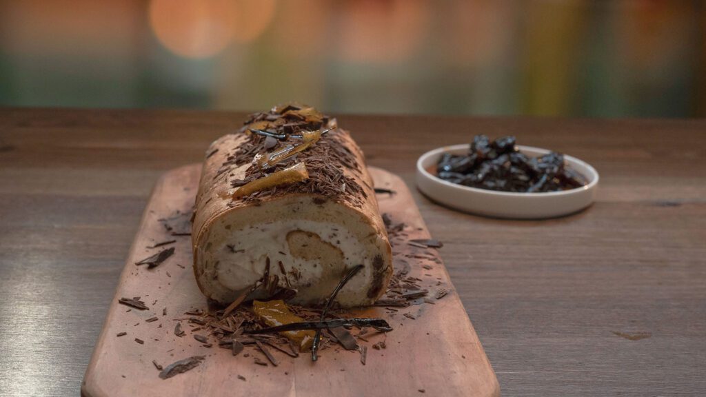Audra’s swirled dark chocolate and vanilla chiffon cake, layered with Oloroso-laced cream and paired with stewed prunes soaked in sherry and lemon was a nod to vintage European patisserie – with a very MasterChef Australia upgrade.