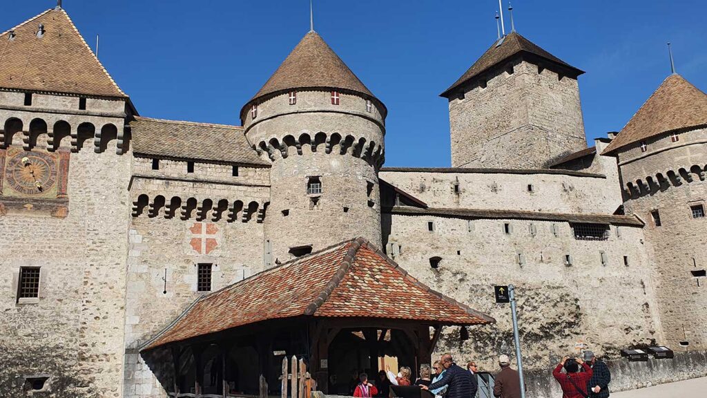 When we arrive at the Chillon Castle there’s a little walk to do. We give everyone one of those box systems with headphones and a meeting point. This means everyone can just do their own thing for 10 minutes and wander about. I always point out the best photo opp, which is the little walkway overlooking the water. If you go down there you can get a really good photo looking back at the castle. You’ve got the blue lakes, the snow with the mountains and the sun shining down on us.