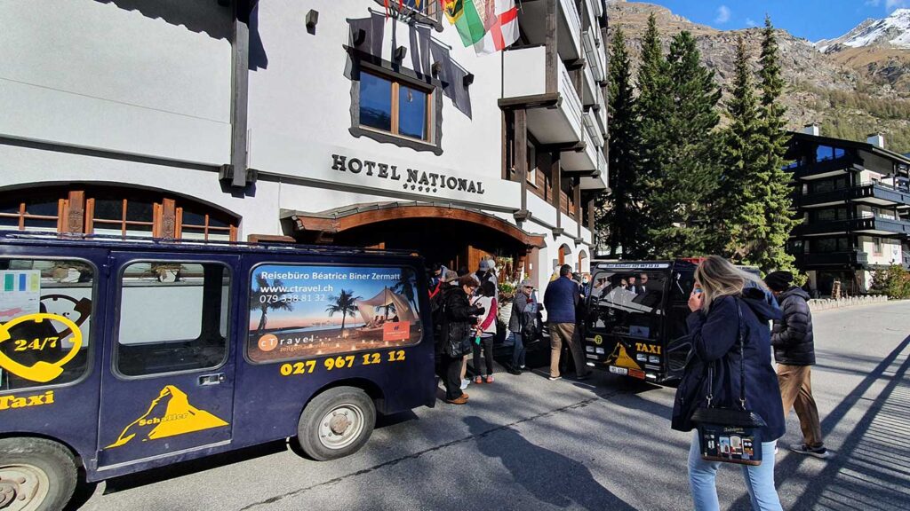 Zermatt is entirely traffic free, so to reach our hotel with all our bags we have to board these little electric taxis. Of course, we’re a group of, I think, 43, so I had to do the maths and divide us up into seven people per taxi. I jump in the first one so I’m at the hotel first ready to get everyone a room number, share the WiFi details… and where the bathrooms are, of course.