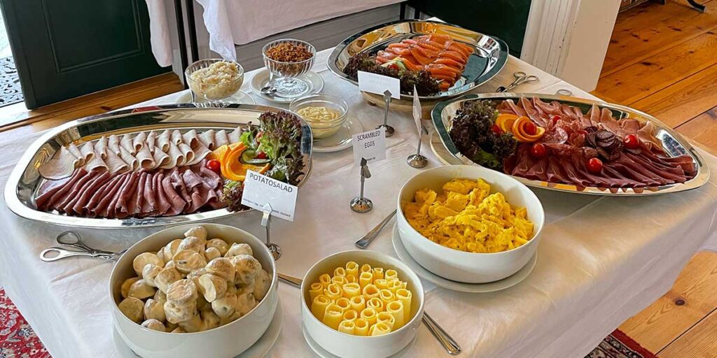 Around 6pm we’ll head to the main house for dinner where they serve up Norwegian party food. It’s traditional food that you might eat at celebrations. There’s rømmegrøt, which is a local sour cream porridge, plus sliced ham, smoked salmon, potato salad, scrambled eggs, bread, butter and loads of different cheeses. For dessert there’s kransekake, which is ice-cream with little Scandinavian treats like almond marzipan.