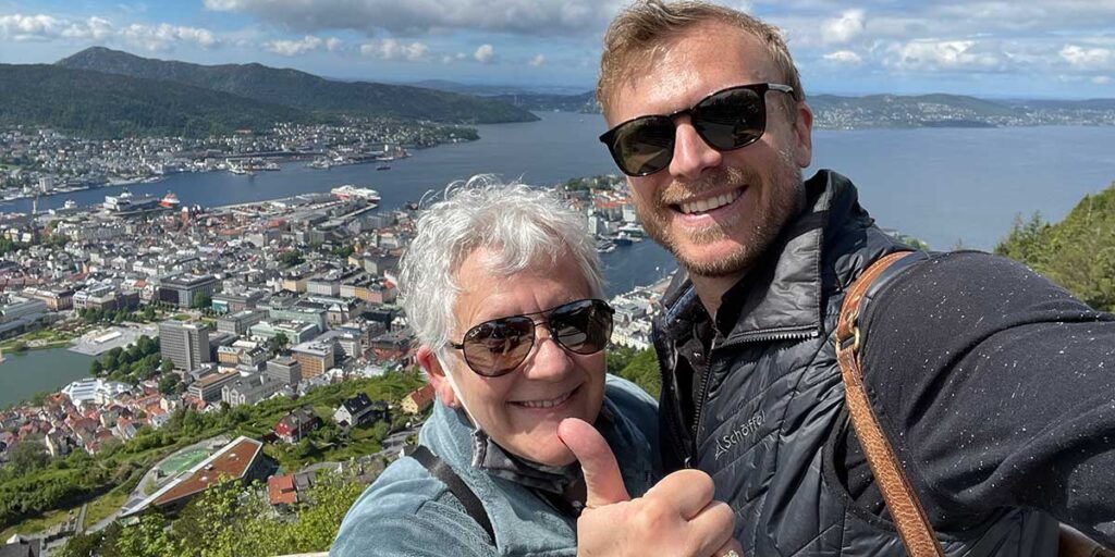 I take the group on a walking tour through the lanes filled with authentic and old souvenir shops with little jewellers and the like. From there, we take the funicular railway up one of Bergen’s seven surrounding mountains. You don’t go to the very top, but the view is brilliant.